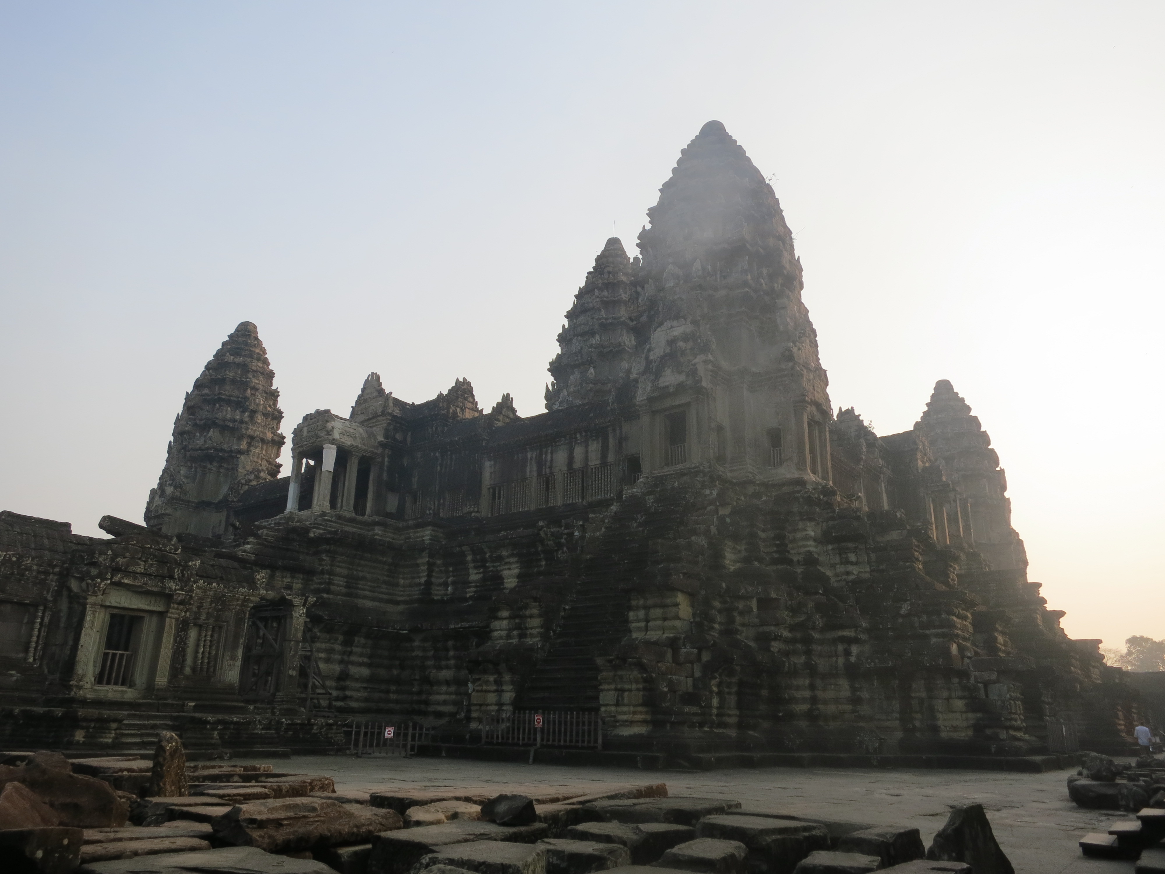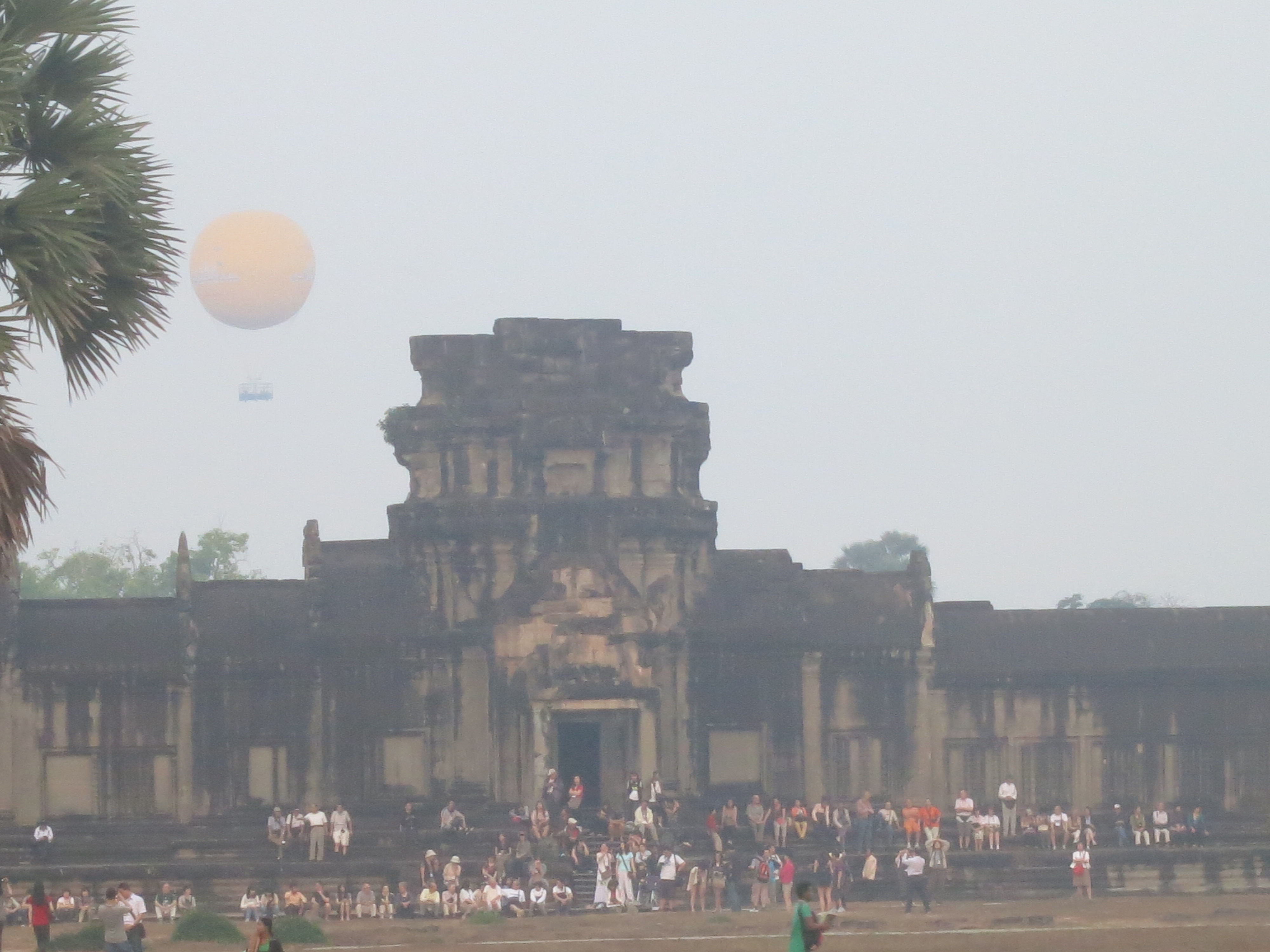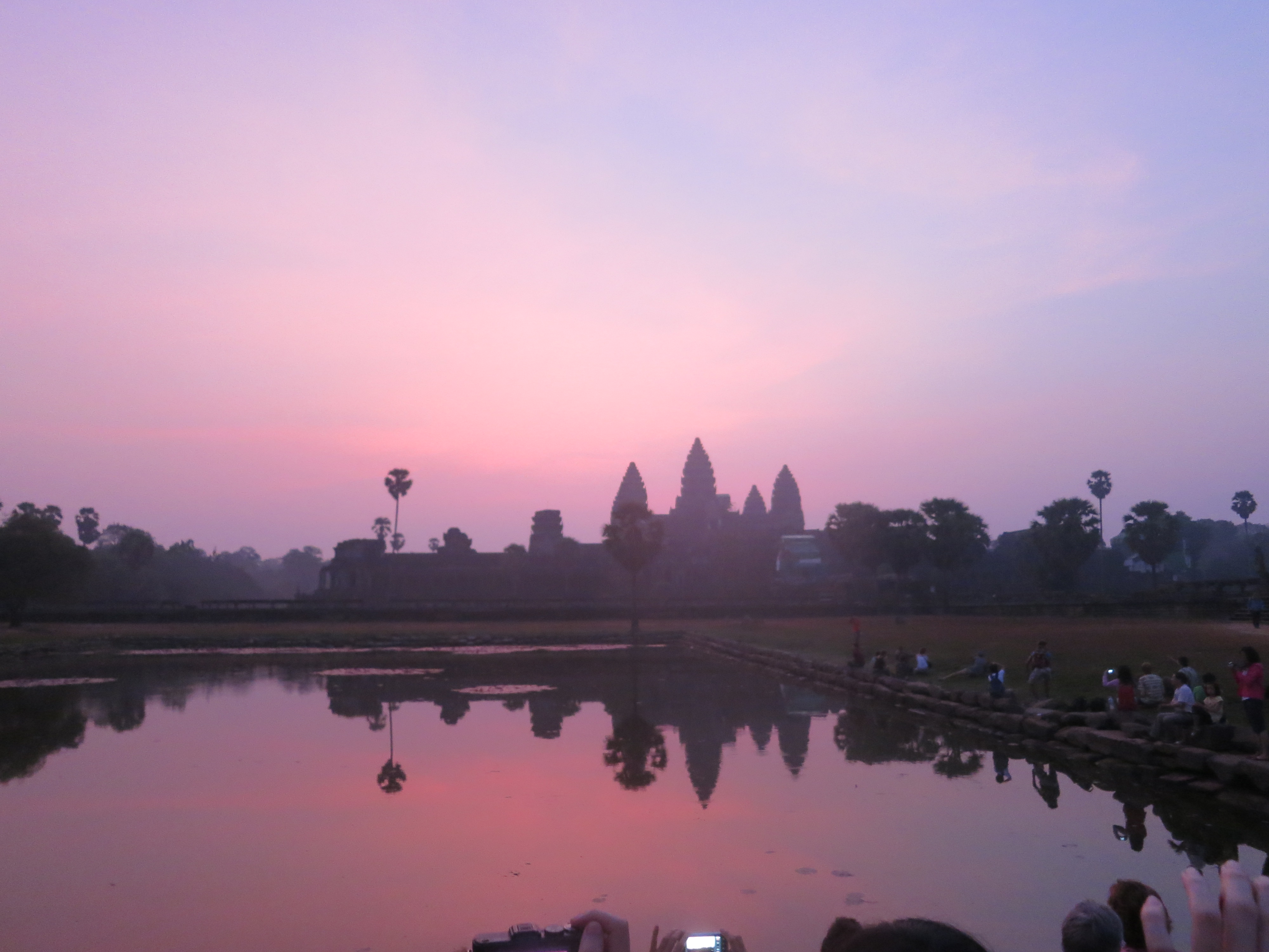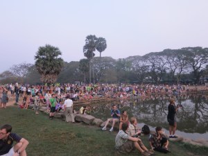 I did it. I answered the 4.45am alarm call and was present, correct and sober in the lobby at 5.15. Jumped into car, driven by hotel employee, and sped off into the darkness. Not many people around at that time of the morning, in fact it was obvious that the only ones around were making the same pilgrimage, couples in tuk tuks, couples on bicycles, others in cars. It’s not far to the main gate where I bought a three day pass, $20.00, then on again, into the darkness. Parked in massive lot, will I ever find this white Camry again, and clutching water, camera, flashlight and ticket joined the silent throng moving to who knows where. Across what looked like a bridge, upstairs, downstairs and then it seemed we were in a massive theater like field. The flashes from cameras, the flashlight beams, the low chatter was vaguely reminiscent of waiting for the main act at an outdoor music festival. The best viewing area appeared to be in front of some sort of pond but not wishing to fall in I took a spot on the edge of the crowd and began the wait.