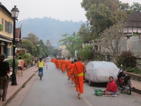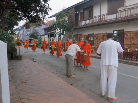 A very slow day in Luang Prabang as predicted. I did leave the hotel at 5.30am to catch the bus into town as one of the big attractions here is the early morning Binthabhat ceremony when the monks from the 30 odd monasteries in town process down the main street receiving alms from the citizenry. As well as receiving, the monks also donate some of the food stuffs they are given to the less fortunate, children mainly, as far as I could see.