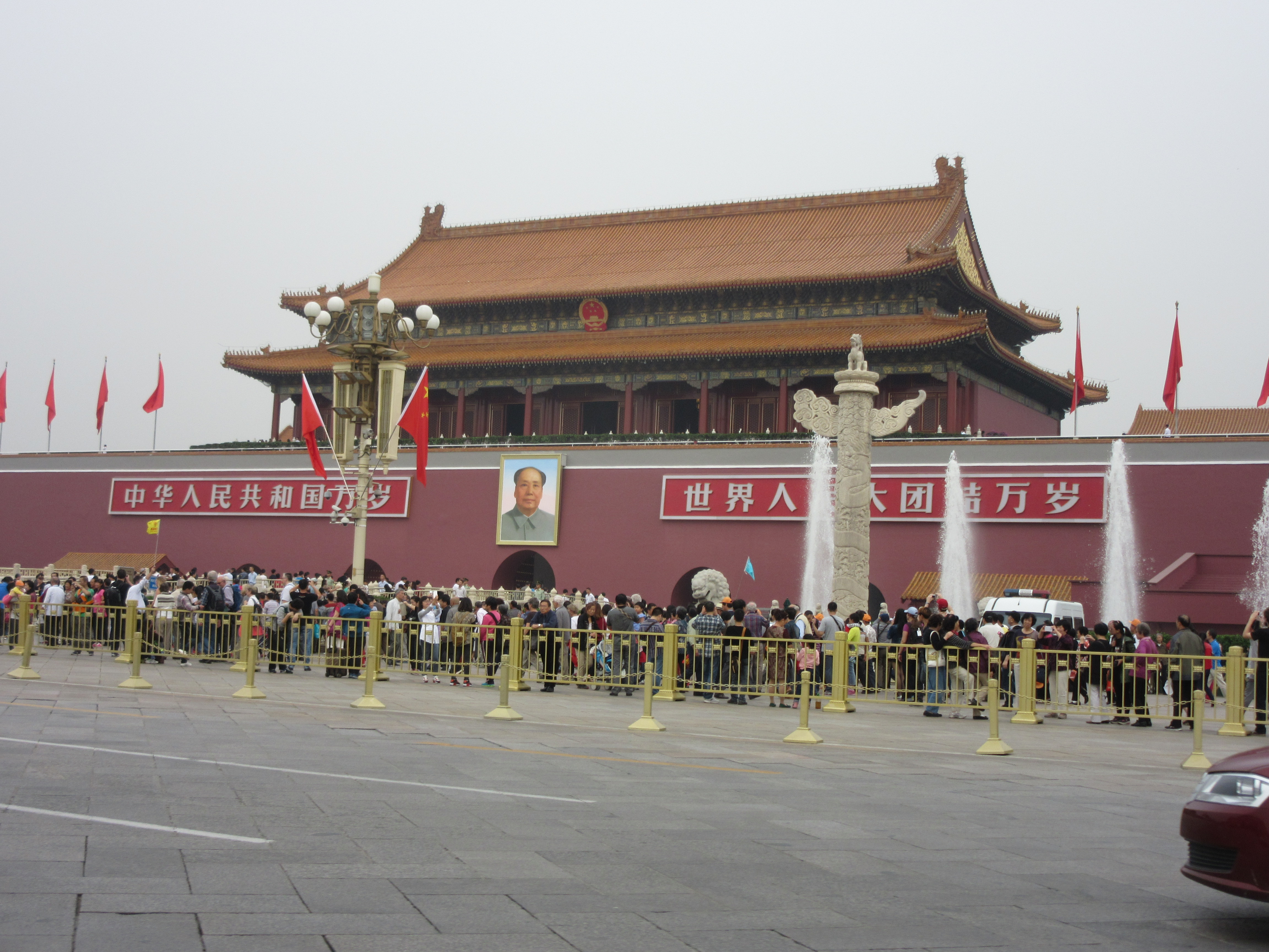 I was chatting with the Concierge staff about my taxi ride to the Palace and asked if they would explain to the driver to drive past Tiananmen Square on the way so I could at least glimpse it. It is rather famous. Yina hummed and hawed then said, come on, I’ll take you, in one of my cars. Pardon? Take me? One of your cars? Sure, lets go, it’s a bit slow today and it will be a good lesson for one of the trainees. Down into the bowels of the staff parking lot and we piled into her rather smart Buick van. On the way she explained that she wanted a BMW but her husband had reservations as he thought she drove too fast. I got to see the famous Square in some style and didn’t have to join any of the huge security lines to gain access. They worry about the Falun Gong setting themselves on fire she explained, nonchalantly. She took photos for me out of the driver’s side window. I heard great stories about the Olympics, how an Australian tv crew were staying at the hotel and couldn’t be bothered to attend some of the events they were supposed to cover so gave the tickets to the staff. She had been to the gymnastics and the swimming, for free. Not only that. The tv crew had their own butler, provided by the hotel, who used the two tickets the crew gave him to the Opening Ceremony to treat his Dad. And Then. He sold his two tickets to the Closing Ceremony, bought a new car and retired back to his village. $10k each. Eat yer hearts out Olympic fans. It was great, she said, all the subways and buses were free for the duration of the Games, but nobody at the hotel used them, they all had to stay in the basement parking lot which was converted into dormitories. They were paid for 24 hours a day for the duration of the Games, but worked regular shifts. Nice.
